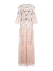 The CHARLOTTE DRESS is a modern lace gown in Champagne/Pink. A signature style, delicately embroidered with a floral lace artwork. Designed with intricate trimmed lace in pretty border motifs and perfectly positioned tiers through the skirt. Crafted from soft, kisses tulle creating a romantic texture throughout.