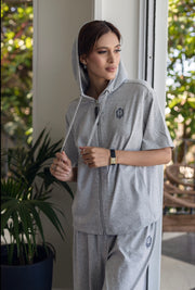 The hoodie features a short sleeve design with a zip closure & relaxed fit whereas the jogger pants is a loose flare silhouette. The set is perfect for layering, all-day wear & ideal for lounging or sports play.