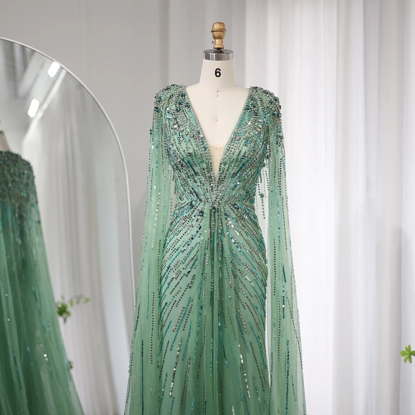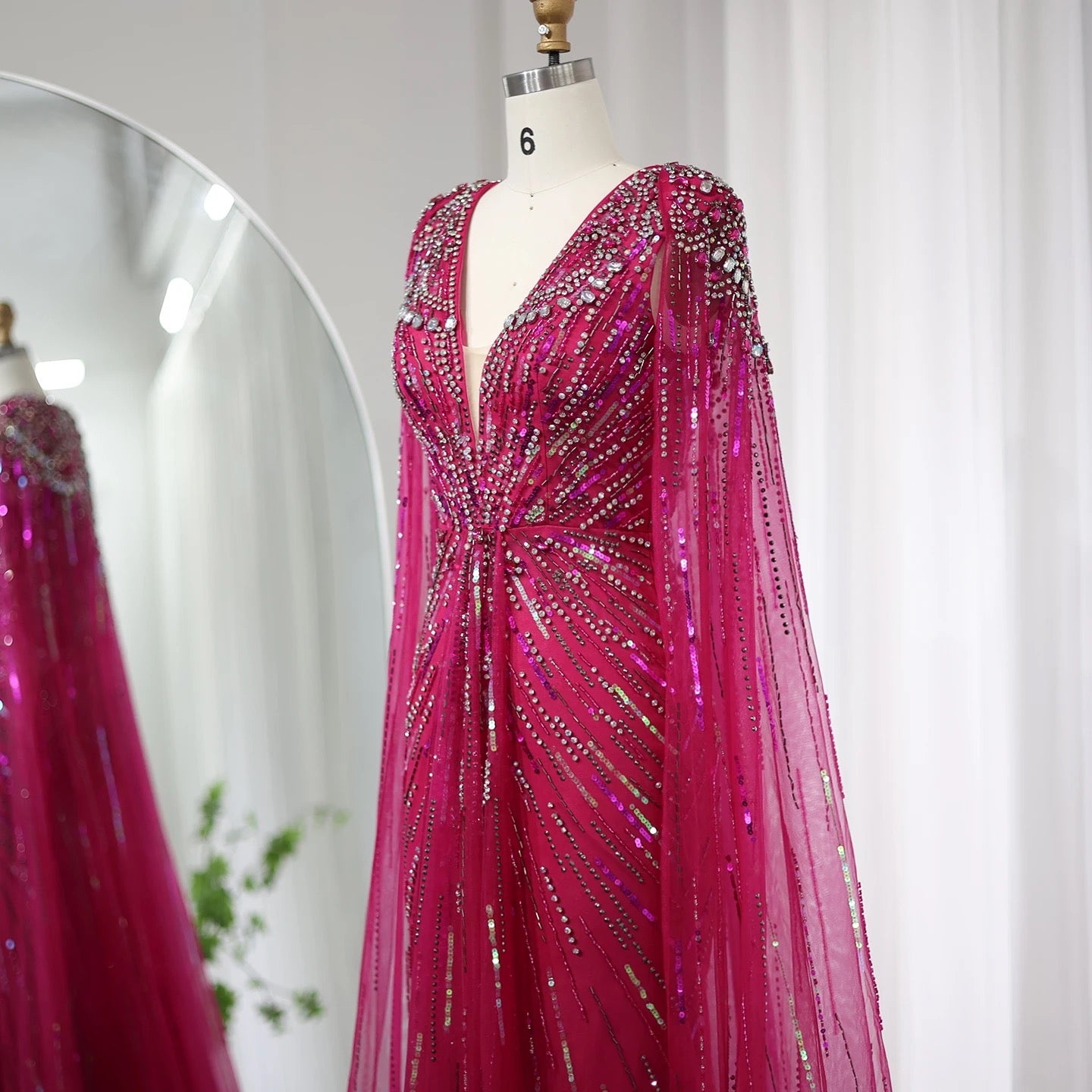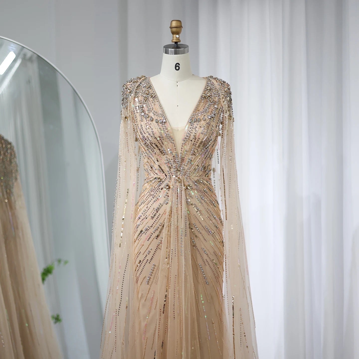 IMAAN is a signature embellished gown that embodies Old Hollywood glamour studded with shimmering crystals, beads and sequins from head-to-toe . Cut from swathes of lightweight tulle, it's covered in sequins that catch the light at every turn. The structured shoulders are embellished with crystals that cascade all the way down the floor-sweeping cape.