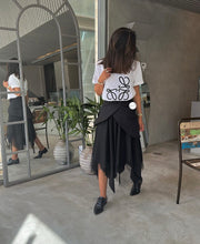The ADIRA SKIRT is a black asymmetrical patchwork mesh skirt