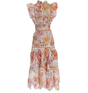 AVERY is a luxury printed lace high neckline dress with cutwork detailing.