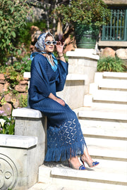 AZMARA is a pleated batwing solid dress with a cut work tassel finish
