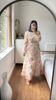 DANICA is a printed luxury long sleeve mesh patchwork dress with cascading ruffle detailing
