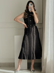 FAYE is an elegant black round neck sleeveless dress with crystal beaded detailing .