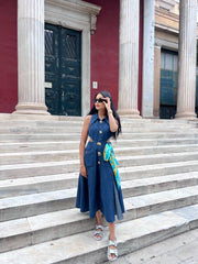 BORDEAUX is the perfect summer denim dress with a turn down collar , cut work detail & exaggerated gold motif buttons to complete the ensemble