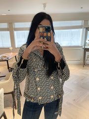 DA VINCI JACKET is luxury monochrome double-breasted jacket featuring a monogram pattern, shawl lapels, double-breasted button fastening and long sleeves.