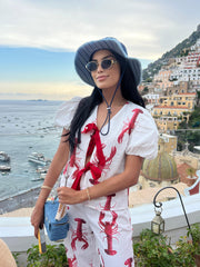 LOBBY is a fun lobster print co ord with a tie front blouse & matching pants