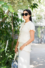 PENINSULA is a two-piece set with a textured cardigan and a matching layered skirt.