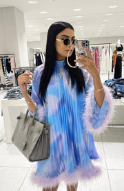 PROVENCE is a collared flare sleeve printed dress with a feather trim finish