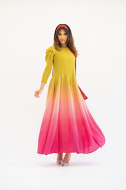 AMEERA is a modest ombre dress with a O neck & Plissè detailing
