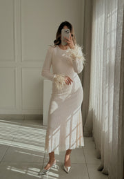 GISELLE is a gorgeous neutral sequin dress with a feather cuff detailing .