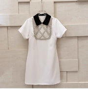 The JUDITH DRESS is an exquisite mini dress/ longline top crafted in a classic white hue wwith the perfect way to add timeless elegance to any ensemble. The black contrast satin collar is complemented by luxe jewellery details, while the short sleeve design ensures comfort and style. It features an invisible zip closure at the back, so you can slip into stunning sophistication with ease.