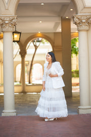 LEAH is a elegant white tiered mesh dress with lace & embroidered detailing.