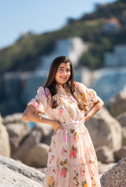The LEEN DRESS is a lantern sleeve summer dress with a floral print detailing & cascading ruffles