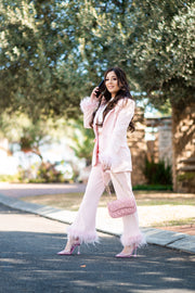 The MERLIAH SET is a European inspired two piece set with a solid blazer & trouser featuring a luxurious feather trim on the cuff of the blazer and suit pants