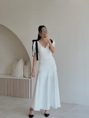 NARA is a captivating coquette themed dress with a flattering silhouette , v neck & black bow detailings on the shoulders .