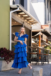 The OCEANA is a royal blue tiered taffeta high waisted skirt with a matching ruffle blouse