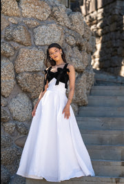 The SOFFIANA is a gorgeous monochrome gown with a spaghetti strap corset adorned with bows & a ball gown skirt finish.
