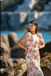 TELEESE is beautiful French inspired lace dress with puff sleeves and floral embroidered detailing . The dress is available as a Midi / or longline dress.