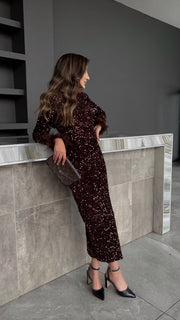 The LADY GODIVA DRESS is a long sleeve sequinned bodycon dress with a feather sleeve finish