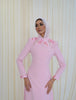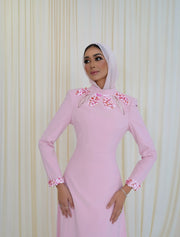 Immerse yourself in the serene elegance of The AMAL gown. Crafted in a bespoke, flowing silhouette of soft sky-blue or pink , this dress is exquisitely detailed with three-dimensional floral appliqués on the shoulders and cuffs. The long, tailored sleeves and gentle column cut offer a sophisticated and modern line.