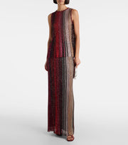 ASTORIA is an O-neck metallic striped set, featuring a sleeveless vest and a skirt