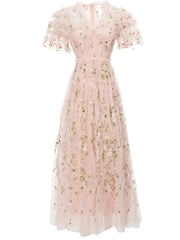 The MAIA is a floral pink mesh dress with embroidered detailing