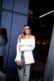 DAPHNE is a solid cold shoulder chic blazer with patchwork detailing. Available in black & white