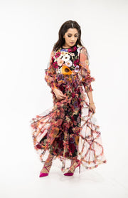 The FIORE DRESS is a floral maxi dress with lantern sleeves and embroidery detailing
