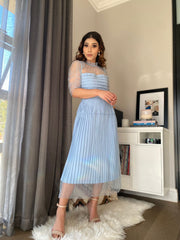 The GIGI DRESS is a elegant blue dot lace dress with mesh detailing