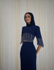 The JOUD Gown, a masterpiece tailored in a deep, striking navy blue/ red. The fitted silhouette is dramatically contrasted by the densely embellished bodice and cuffs, featuring a magnificent cascade of ivory pearls and shimmering crystal beading. Structured shoulders and a flared hemline define this look of unmatched modern glamour and luxurious sophistication.