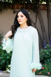 The LAMEEA DRESS/KAFTAN with a rhinestone & pearl neck collar & father sleeve detailing