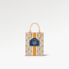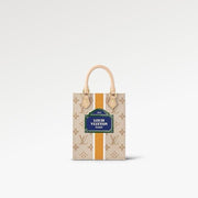 Made from beige Monogram canvas with a textile-like printed effect, the Petit Sac Plat is decorated with a vertical white-and-ocher stripe. In the center of the bag is what looks like a typical Parisian street-sign, featuring the words “Louis Vuitton Paris.” In addition to the two rolled-leather top handles, there’s a removable and adjustable strap.