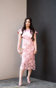 The MARIPOSA is a pink lace patchwork 3D butterfly dress with a rhinestone bow detailing