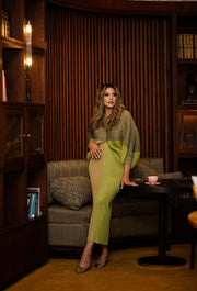 OLIVIA is pleated patchwork midi dress with plissè detailing.