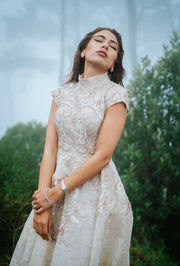 The QUEEN RANIA DRESS is luxury lace asymmetrical formal dress with beaded detailing
