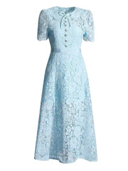 SERENITY is a luxury delicate pale blue dress cut from corded lace. Diamante buttons add sparkle, whilst a lace collar and a bow at the neck add extra embellishments. The flowing midi skirt is gently flared to flatter your silhouette.