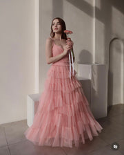 The SIENA is a beautiful tiered dress with cascading ruffles & a V neck spaghetti strap detailing