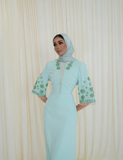 The ZUFREEN gown features a striking silhouette in a crisp, refreshing mint hue. This exquisite piece showcases intricate hand-beaded floral designs in rich green tones across the shoulders and the sophisticated three-quarter sleeves, finished with delicate fringe detailing. The fitted bodice and smooth column skirt create a perfect balance of structure and flow, embodying sophisticated charm.